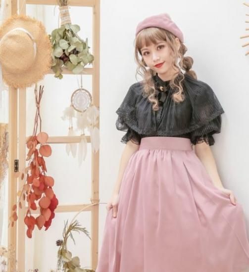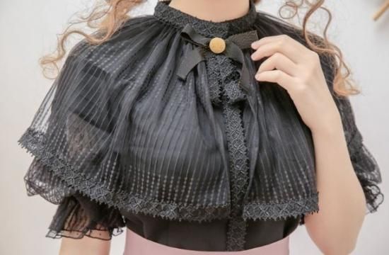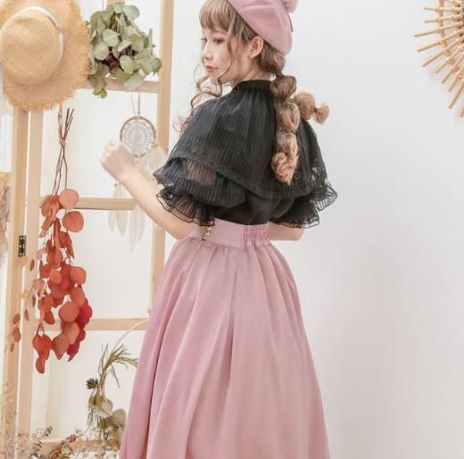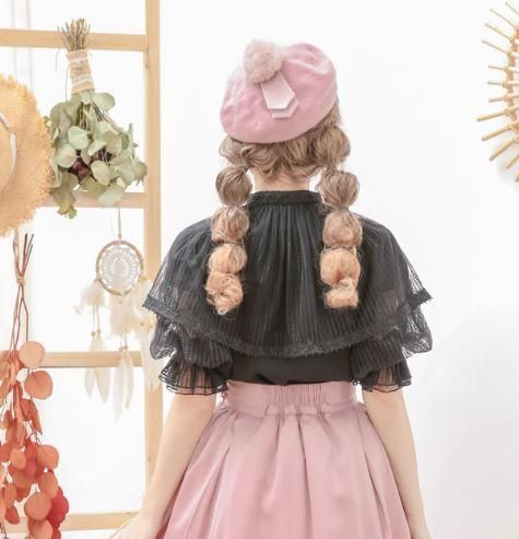 ロリータ Dolly Delly ケープ ドッキング ストライプ ブラウス 2色 ホワイト ブラック 春夏 甘ロリ ストライプ ドット ケープ風 透け感 シフォン パフスリーブ レース リボン