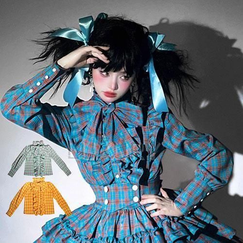 ゴスロリファッション ゴスロリ ブラウス のみ リボンタイ付き チェック柄 4色 長袖 立ち襟 ハイネック アジアン モード系 ガーリー ハード レディースファッション イベント 普段着 普段使い デイリー