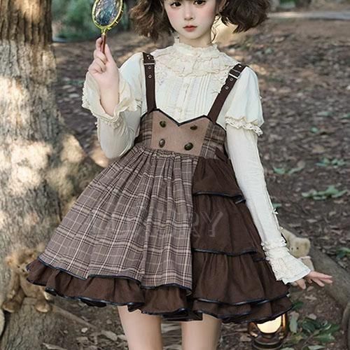ロリータファッション パンク サスペンダー付きスカート+ブラウス 2点セット チェック柄 探偵風 童話風 ミニ丈 ショート丈 膝上 長袖 レース ガーリー スウィート 普段着 デイリー レディース