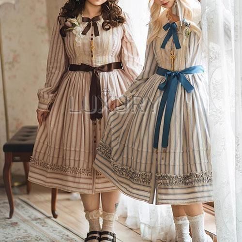 カジュアルロリータ ワンピース のみ 3色 ストライプ リボンタイ付き ひざ下丈 ミモレ丈 長袖 文学少女 ナチュラル 上品 清楚 春秋コーデ お茶会 普段着 普段使い デイリー