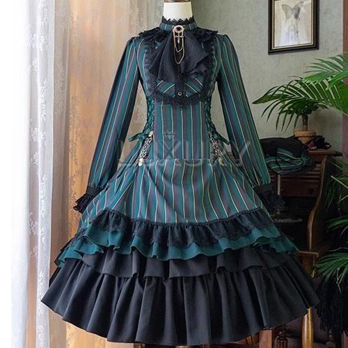 こちらのロリータワンピースは、ストライプデザインと長袖の立ち襟が特徴で、クラシックかつゴシックな印象を与えます。