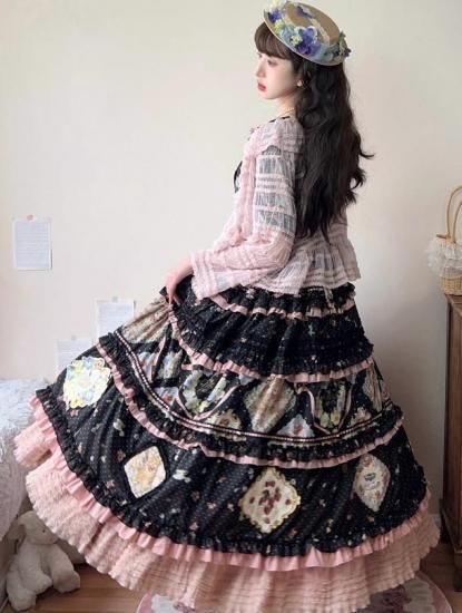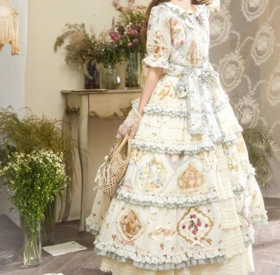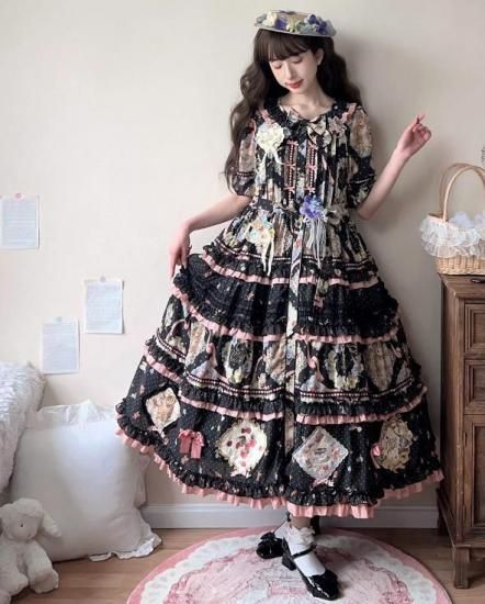 【納期40日】ロリータファッション ワンピース +腰リボンベルトのみ プリント フリル ロング丈 半袖 お嬢様 レトロ 古風 ゴージャス スウィート 春夏コーデ お茶会 イベント