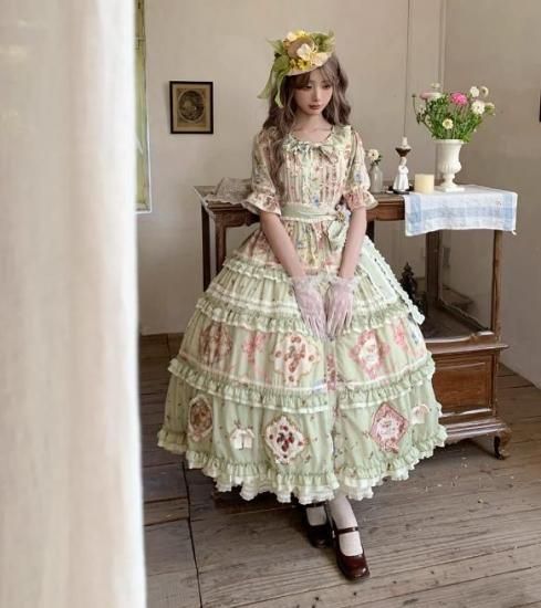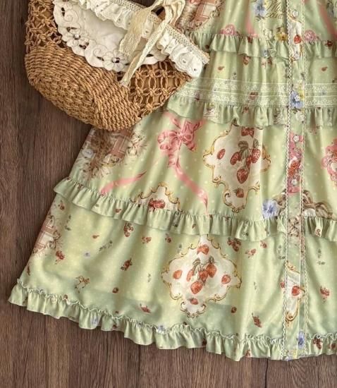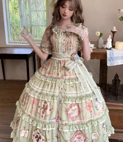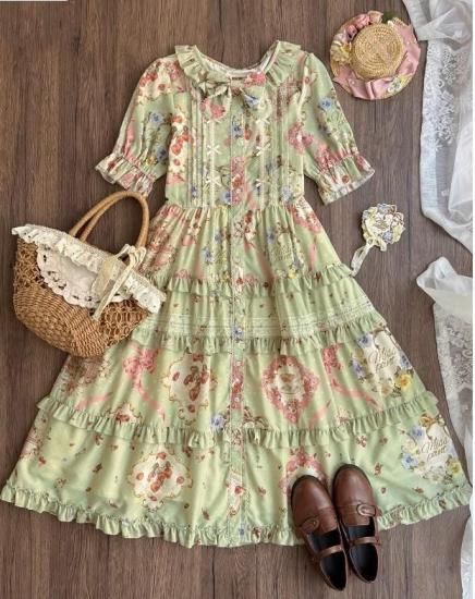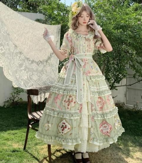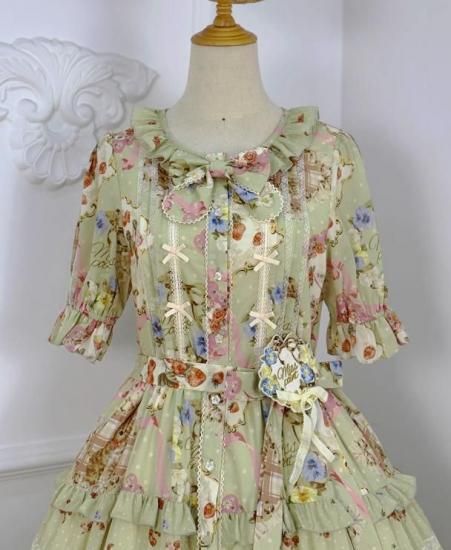 【納期40日】ロリータファッション ワンピース +細ベルトのみ 花柄 フリル ロング丈 半袖 お嬢様 森ガール カジュアル ガーリー 春夏コーデ お茶会 イベント