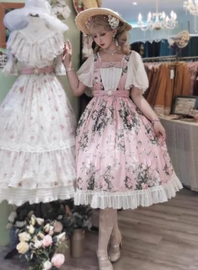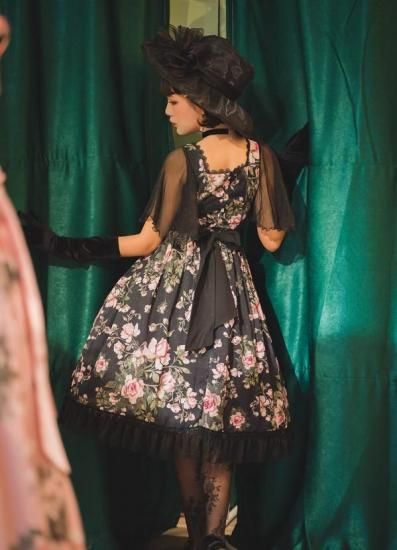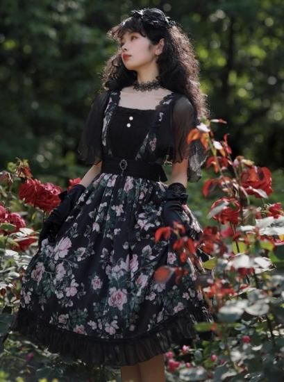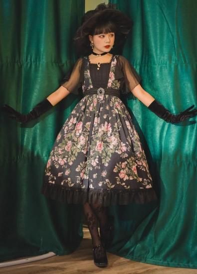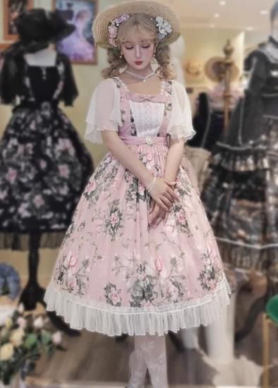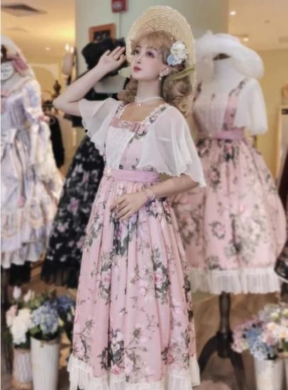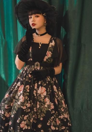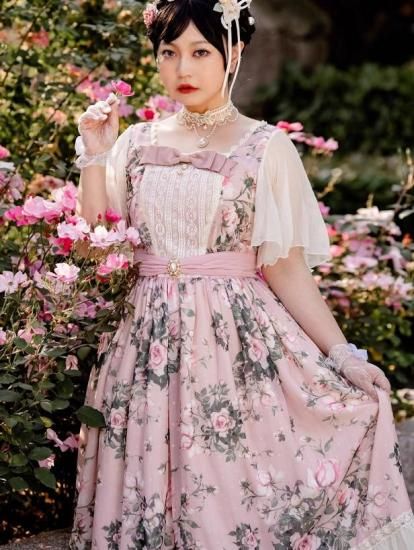 【納期40日】クラシカルロリータ クラロリ ワンピース +ウエストベルト 薔薇 バラ柄 ひざ下丈 ミモレ丈 半袖 シフォン フレンチクラシカル ゴージャス 夏コーデ お茶会
