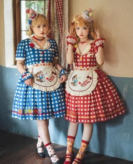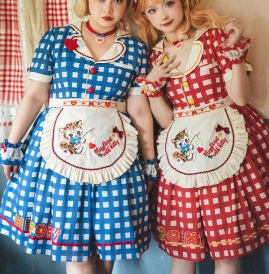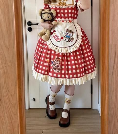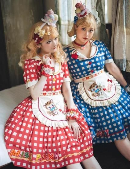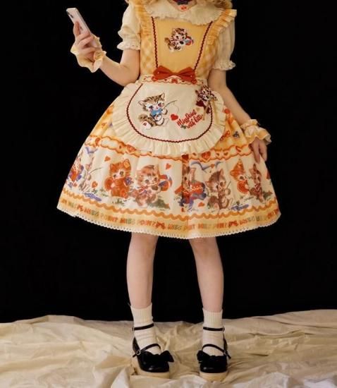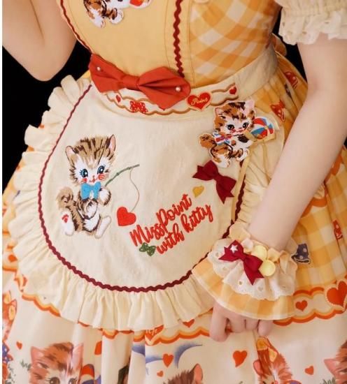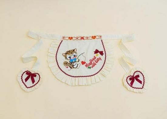 このエプロンは、アメリカンダイナー風のデザインに可愛らしい猫柄とリボンが特徴で、明るいポップな印象を与えます。