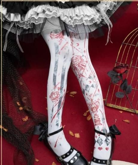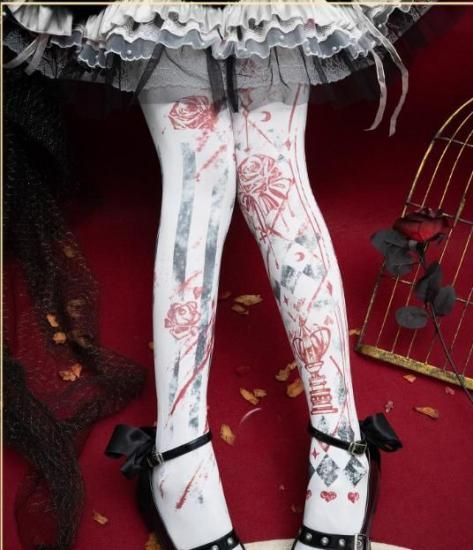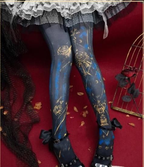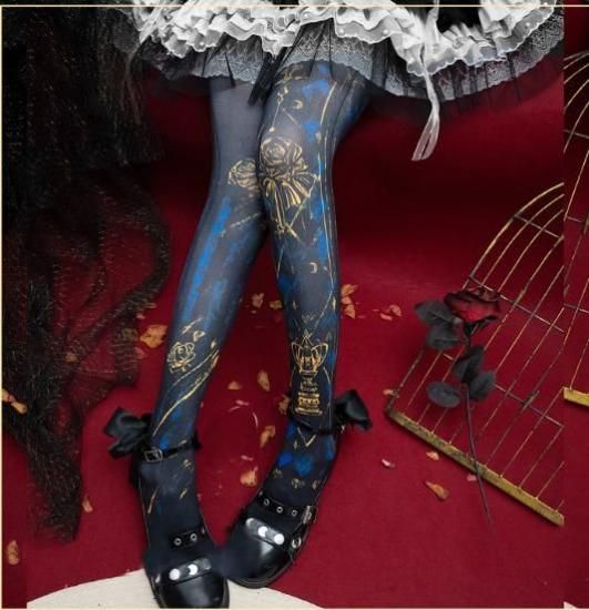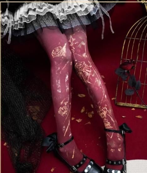 こちらのタイツは、贅沢な薔薇のデザインと巧妙に施された暗黒系のパターンが特徴です。