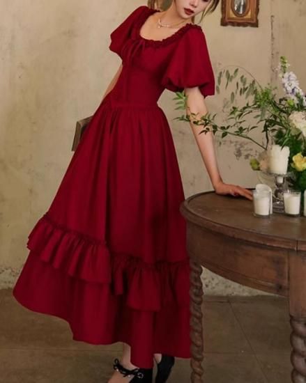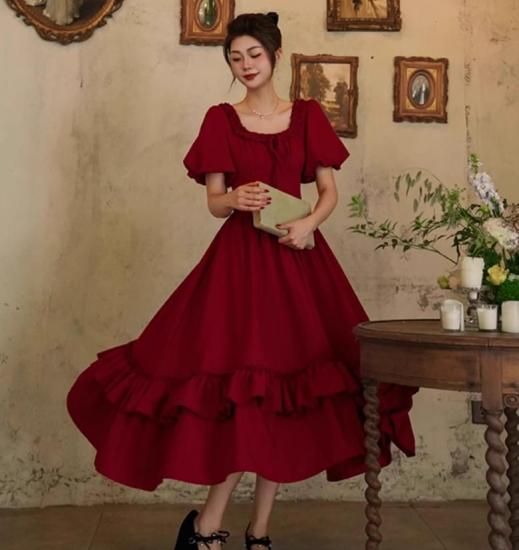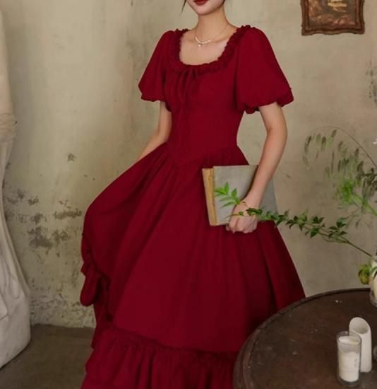 【納期1ヶ月】セミロリータ ワンピース のみ ロング丈 Aライン 半袖 バルーンスリーブ レトロ 古風 クラシカル 宮廷風 華やか 春秋コーデ お茶会 パーティー イベント