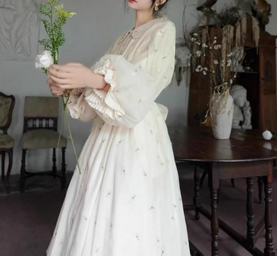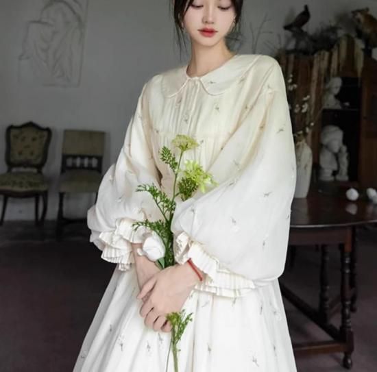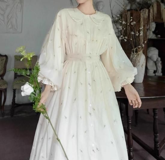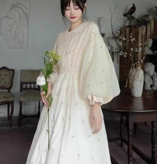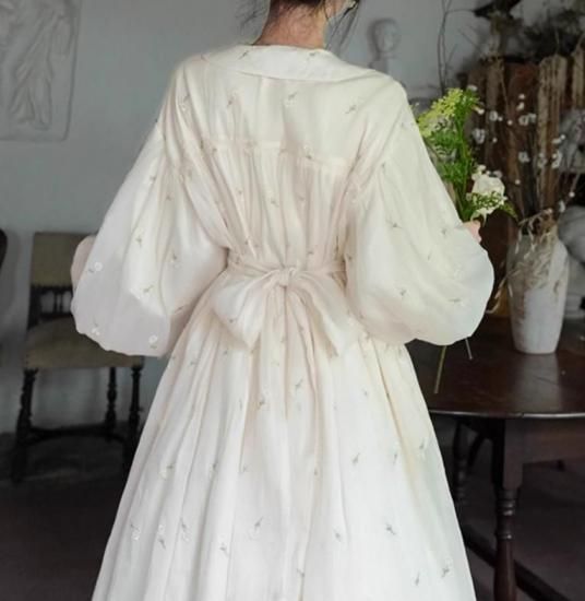 【納期40日】セミロリータ バルーンドール ワンピース のみ ひざ下丈 ミモレ丈 刺繍 ランタンスリーブ 宮廷風 ヴィンテージ アンティーク ガーリー 大人可愛い レディース デート