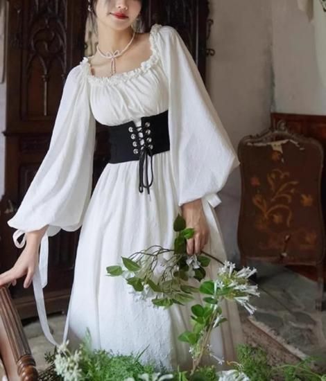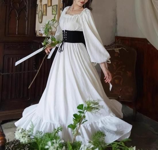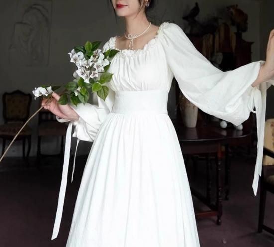 魅力的なスクエアネックデザインと宮廷風スタイルが、クラシカルでありながらロマンティックな印象を与えます。