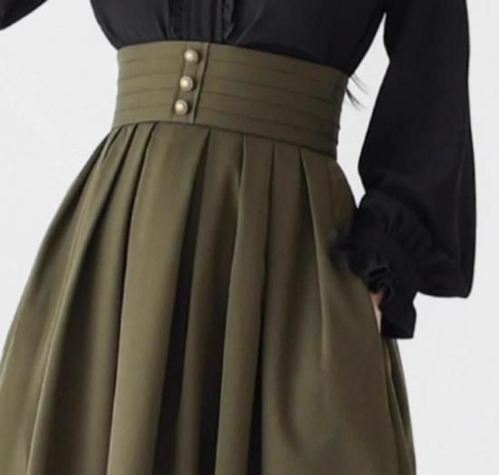 こちらのスカートは、膝丈のミディアムデザインで、コルセットを思わせるシルエットが特徴です!