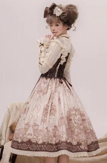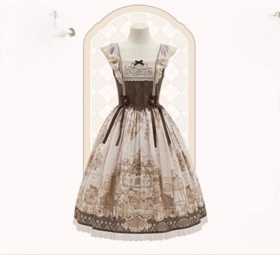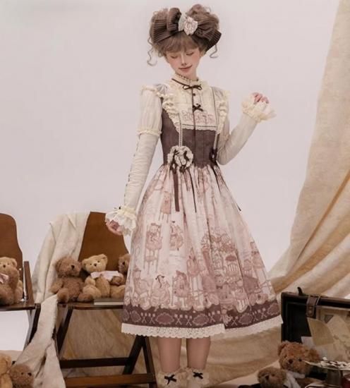 甘ロリ ジャンパースカート のみ 童話風 くまさん クマちゃん クマさん フリル スクエアネック ミモレ丈 お嬢様 かわいい ガーリー ラブリー メルヘン デート