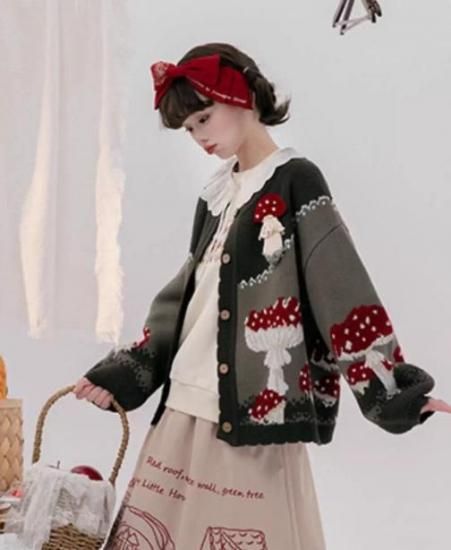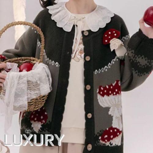 甘ロリ ニットカーディガン のみ キノコ柄 童話風 かわいい ガーリー メルヘン 秋冬コーデ デイリー レディースファッション