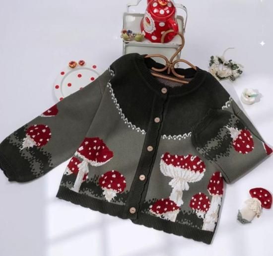 こちらのカーディガンは、キノコ柄の童話風デザインが特徴で、ふんわりとしたニット素材が魅力的!