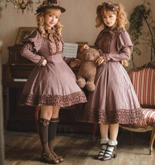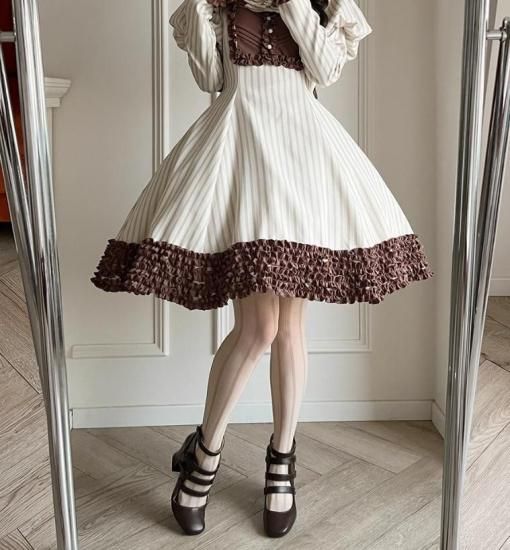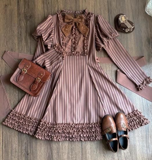 こちらのワンピースは、チョコレートカラーの長袖デザインで、レトロかつスウィートなスタイルが魅力的です。