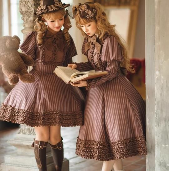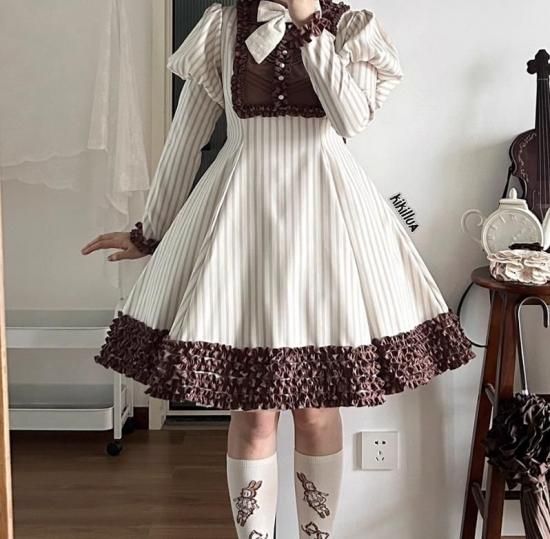 【納期40日】クラロリ ワンピース +リボンブローチ のみ チョコレート 長袖 ミニ丈 ショート丈 膝上 レトロ スウィート 優雅 秋冬コーデ お茶会 デイリー