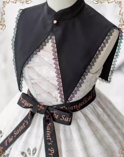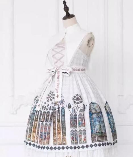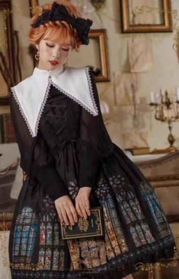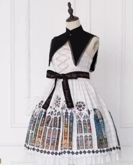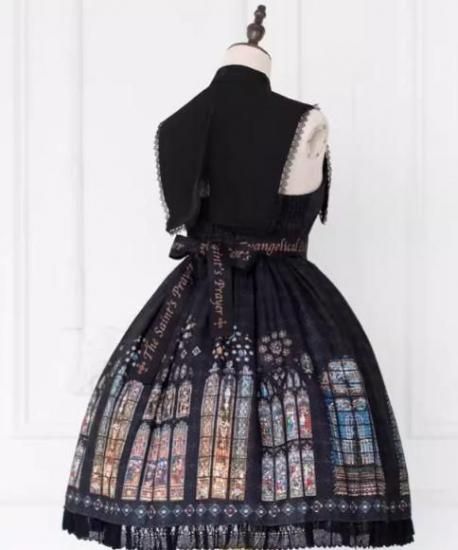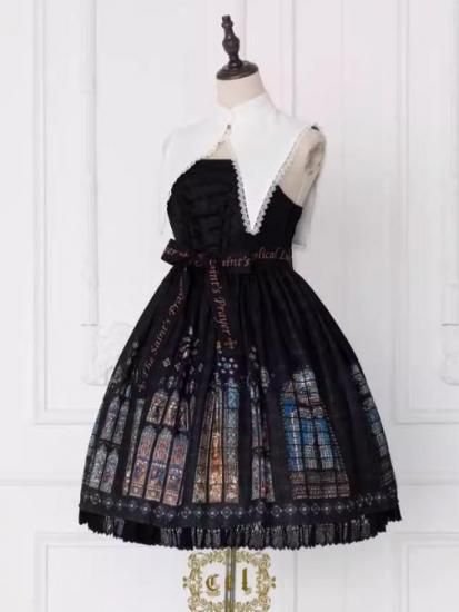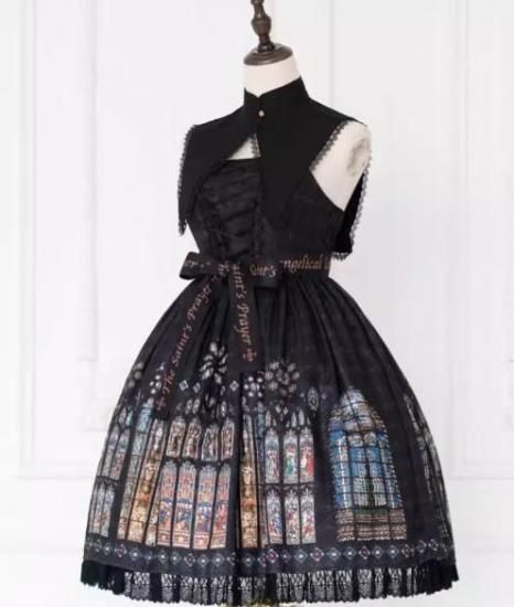 ロリータファッション ジャンパースカート + 付け襟 + ウエストベルト付き 彩色 ステンドグラス風 ゴシック クラシカル 立ち襟 膝丈 ひざ丈 ミディアム 春秋コーデ お茶会 撮影