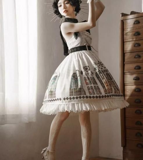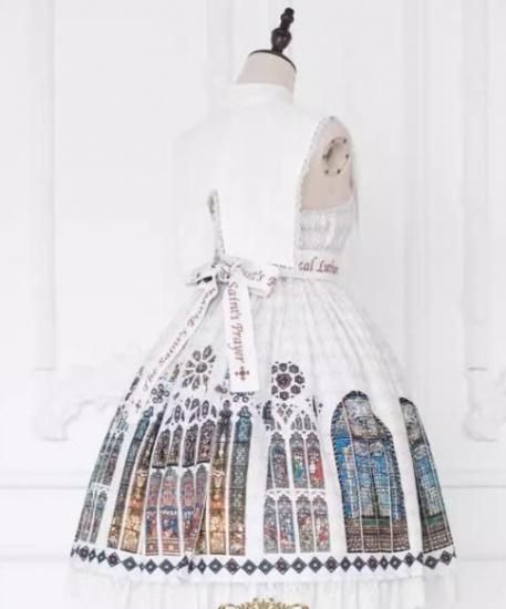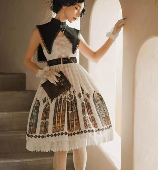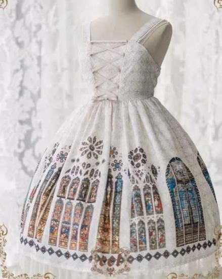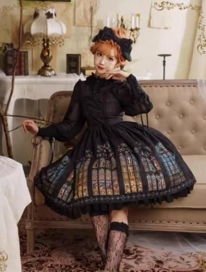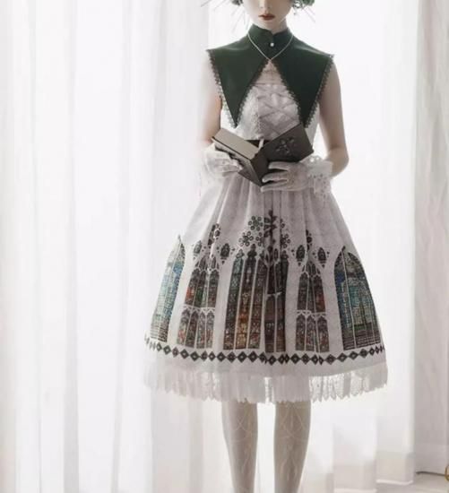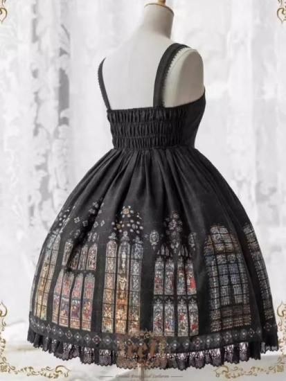 こちらのジャンパースカートは、ステンドグラス風の美しい彩色デザインが特徴で、クラシカルな立ち襟と膝丈が独自の魅力を放っています。