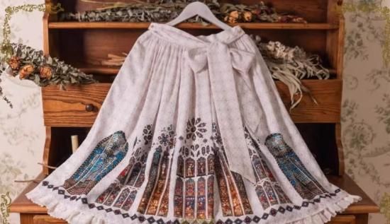 こちらのスカートは、ステンドグラス風の美しいデザインが特徴で、ひざ丈とミモレ丈の選べるスタイルがエレガントな印象を与えます。