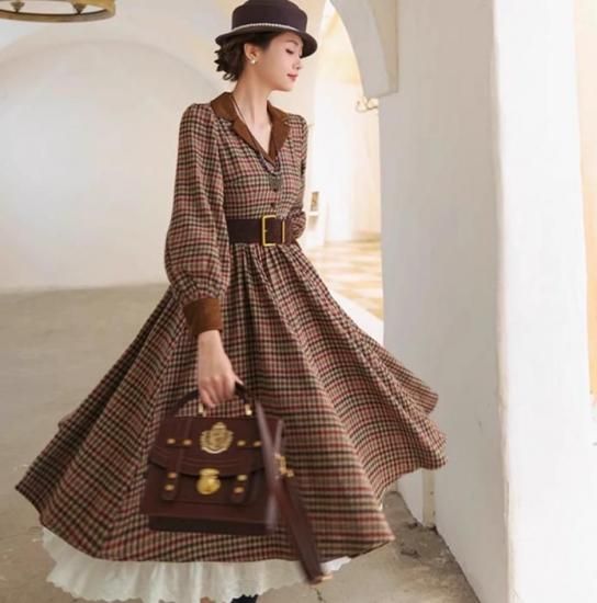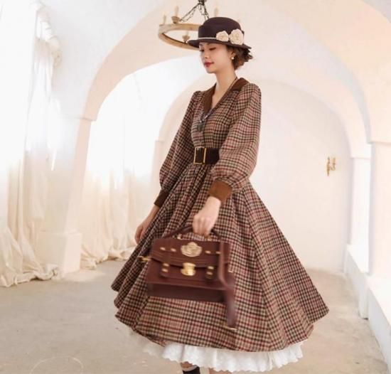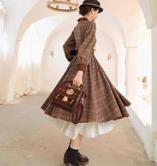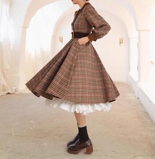 【納期40日】セミロリータ ワンピース のみ チェック柄 フレア ミモレ丈 レトロ フレンチクラシカル 清楚 フェミニン 大人可愛い 秋冬コーデ お茶会 デート デイリー