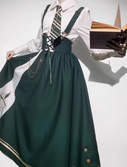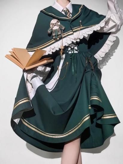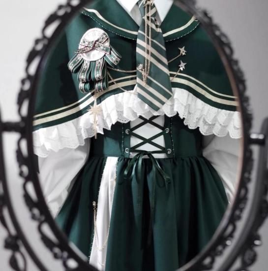 このセットには、サスペンダー付きスカート、シャツ、ケープ、ネクタイが含まれており、童話の世界から飛び出したような美しさを演出します。